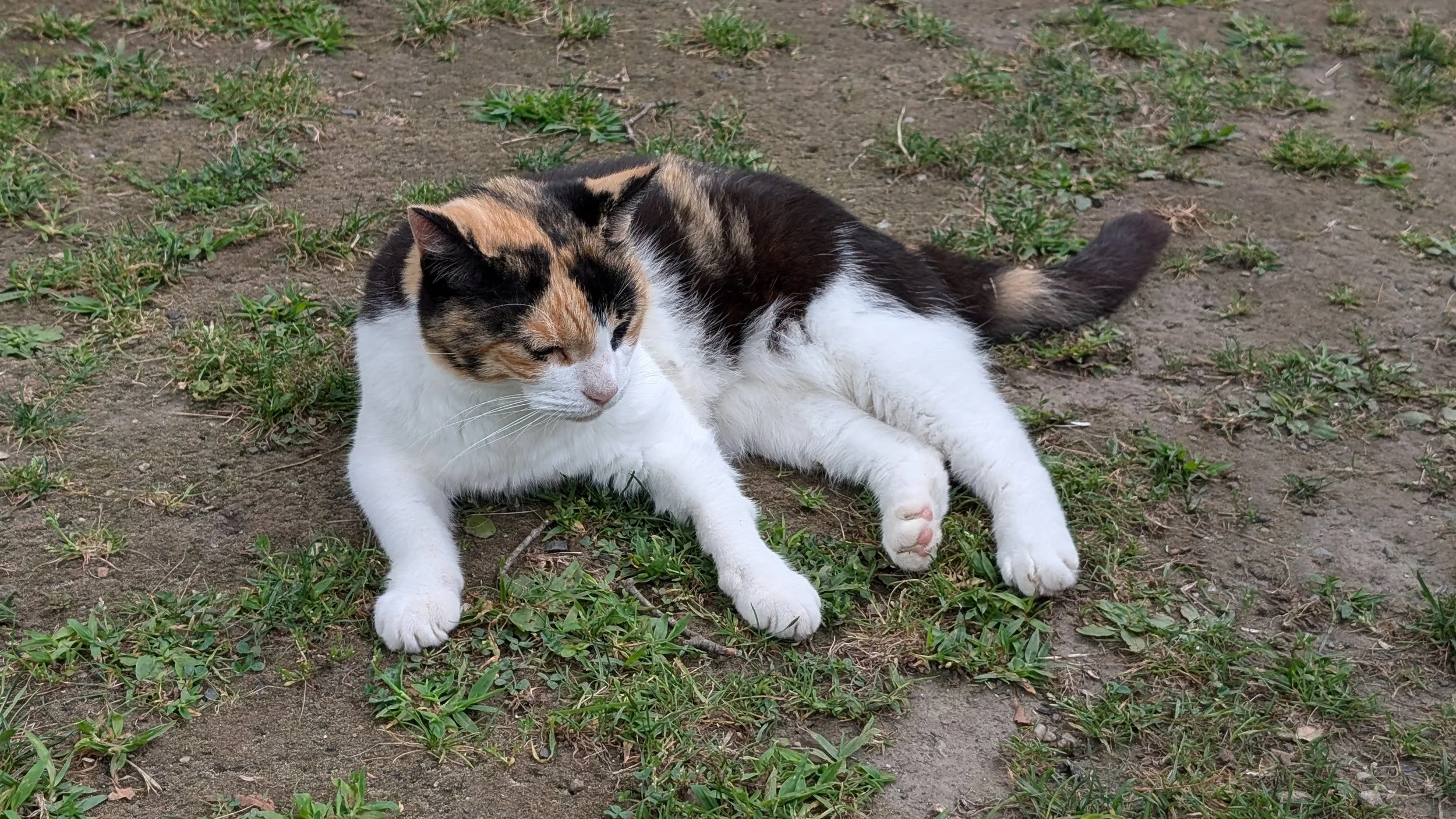 There's also a cat that sort of lives in Tom's yard. It's actually the neighbor's cat, but it seems to like Tom better. Tom doesn't even know its name. It's very cute, but it has a tendency to bite, so Tom has signs up warning people to be ready for that if they try to pet the cat.