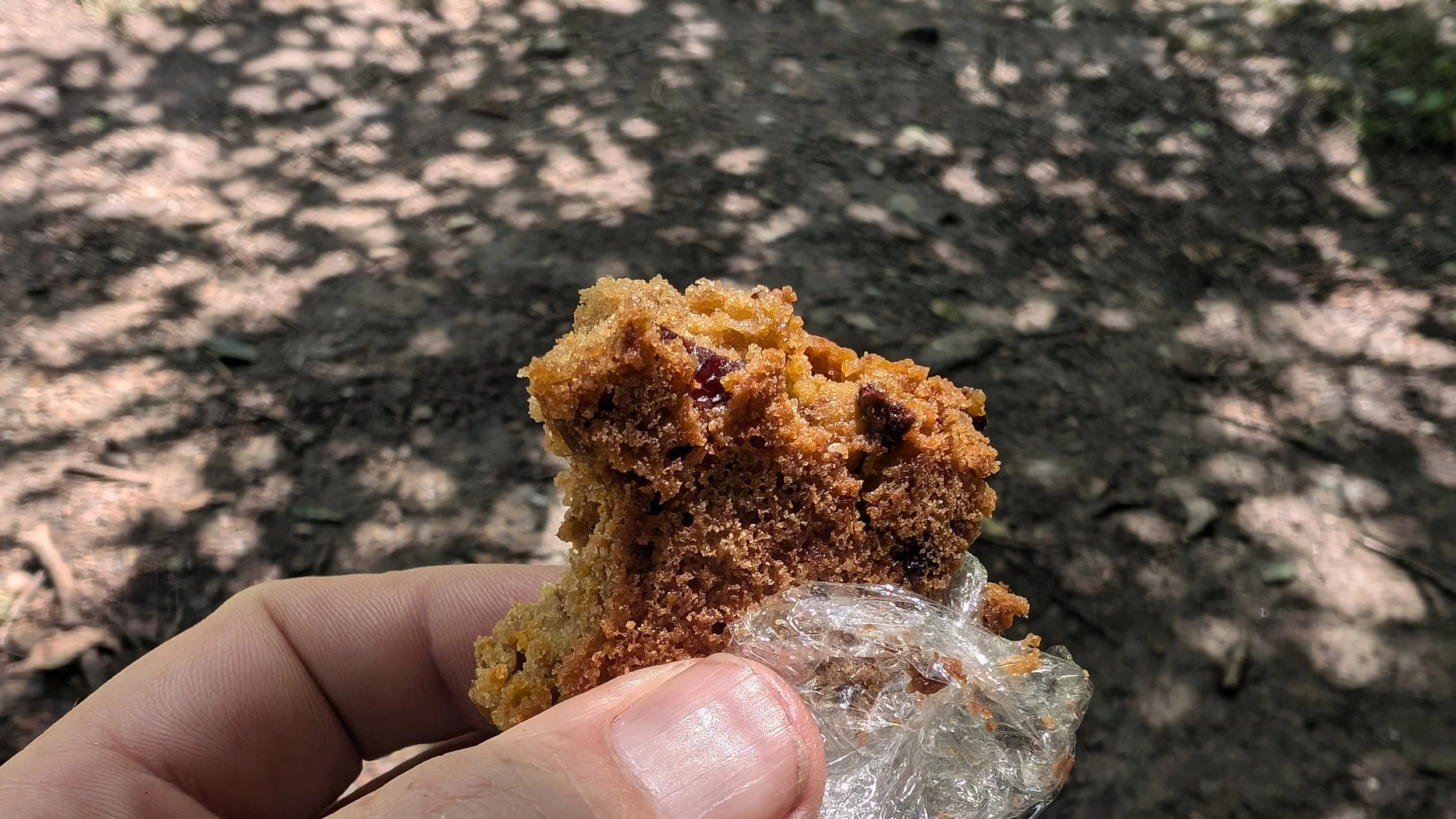 After the long boardwalk, I came to a road crossing and decided to stop there to have some lunch. Before long, Pale Rider pulled up and joined me. Some people were getting dropped off to go on a day hike and asked us whether we’d like any fruit or brownies. Of course, I said yes. So one of them handed me this rather large container of beautiful blueberries and a bag of what this nice lady called kitchen sink brownies. They were more like blondies, but they had nuts and dried fruit and butterscotch chips and caramels and a whole bunch of other stuff thrown in, too. They were fantastic, and I absorbed a couple of those along with the big thing of blueberries.