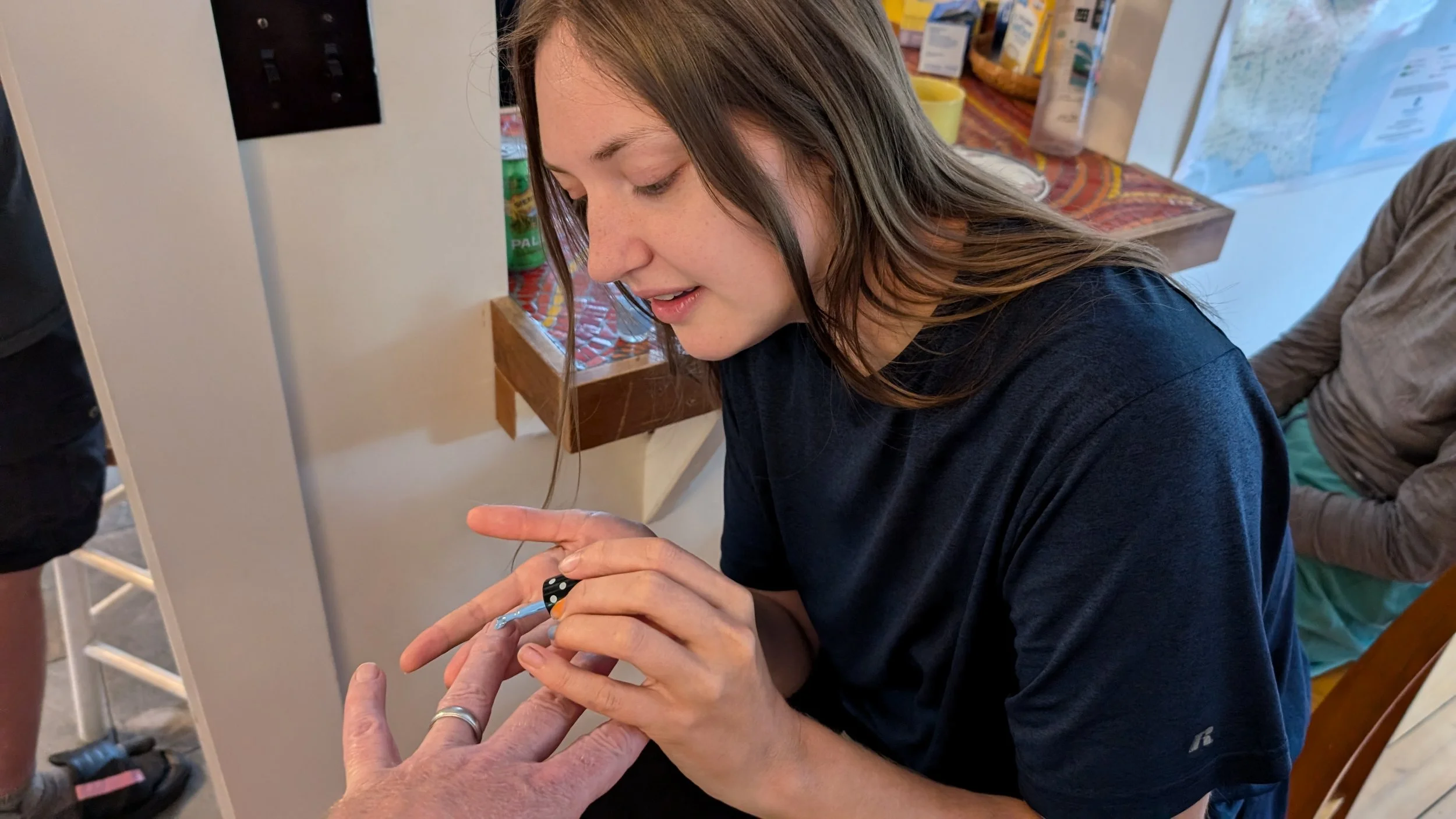 Most of the hikers at the Notch that day were taking a zero, in part because the weather was just terrible. So we had a pretty full house, and everyone was down in the kitchen, wanting some breakfast. And it was a really nice moment. We were all eating together, and people seemed pretty appreciative of us cooking for them, so it was a good start to the day. And after breakfast, to thank me for helping cook, Ultra initiated me into her group by painting a couple of my nails. [Wife note: I could not possibly approve of this more. I’m now an Ultra fan, whoever she is!]