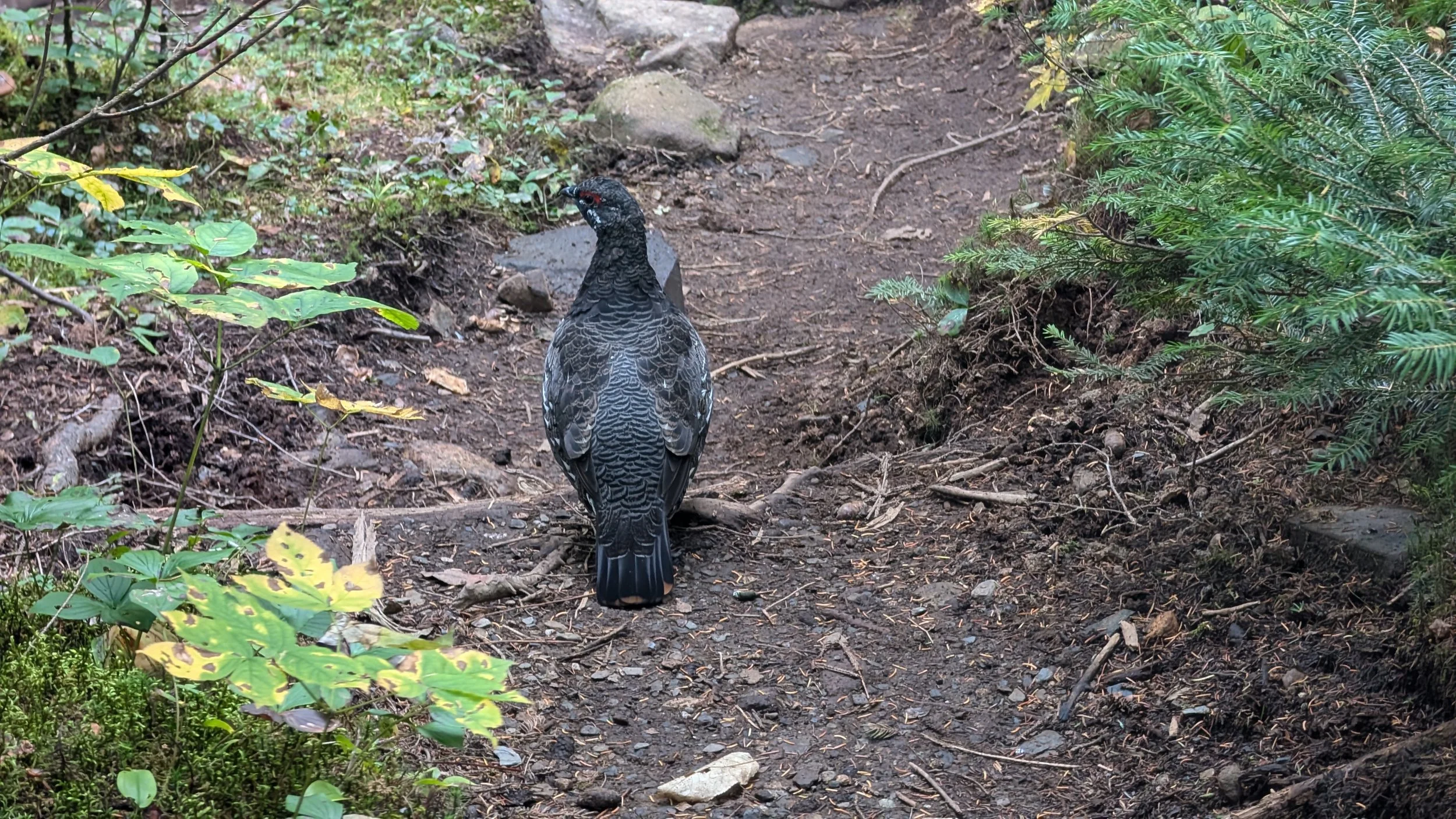The weather was really quite warm. It was very sunny, very warm. I’m just amazed at how lucky we've been getting with the weather. At one point, I crossed paths with what I think was a grouse in the middle of the trail. For a while, it just did not want to move, so we kind of hiked along together for a bit. But eventually, it ran off into the brush.