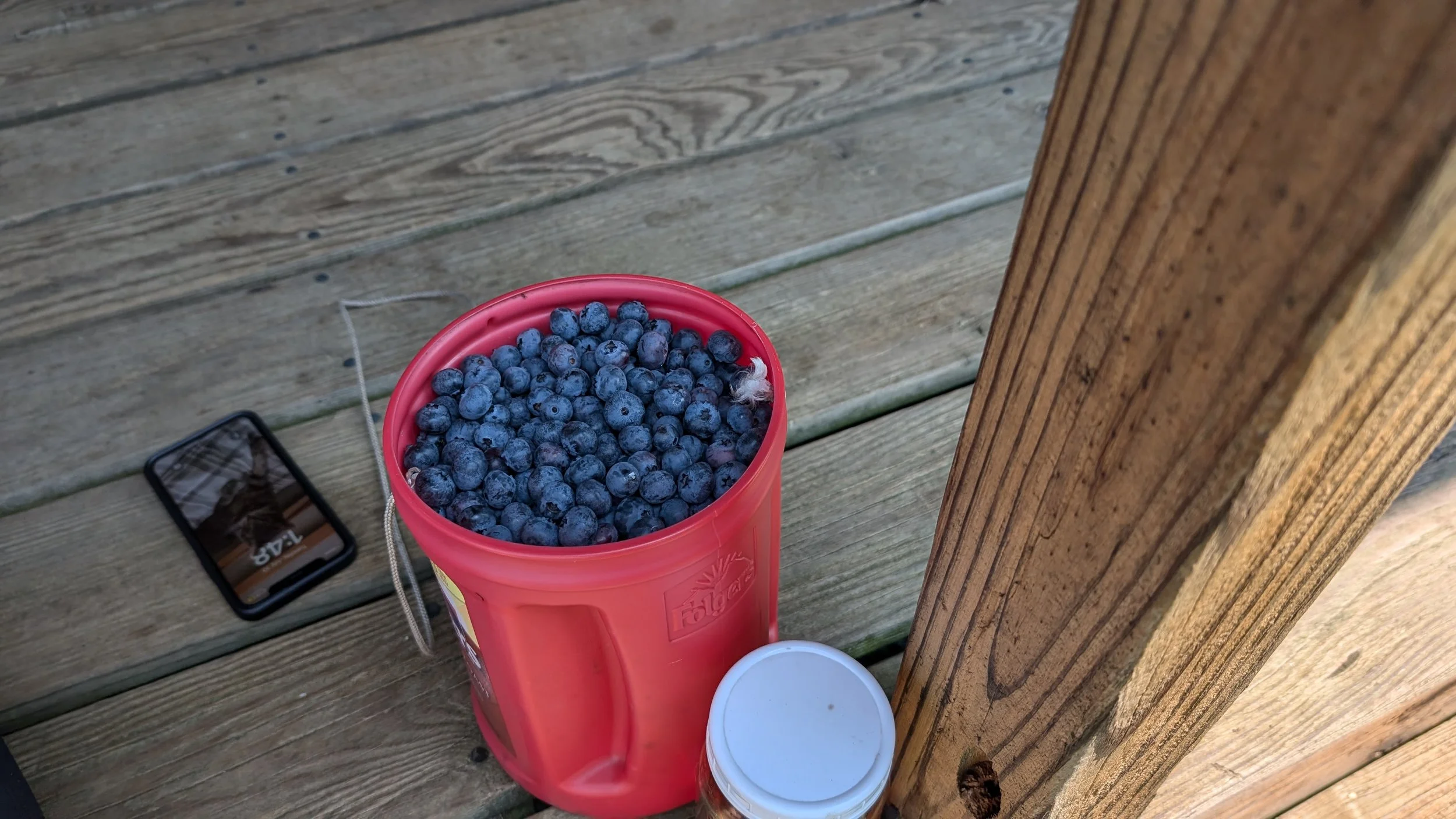 So I made my way over to the Cookie Lady’s farm. It’s one of those pick-your-own blueberries places, and you can pay to pick blueberries for yourself, of course, but if you’re a thru-hiker, you can also offer to pick a bucket of blueberries for her. If you do, she’ll give you a hamburger. Quadzilla, Pyro, 60, Dare, and Matcha were all there, picking blueberries. And another hiker, named Salamander, showed up a little after I did and decided to do the same thing.
