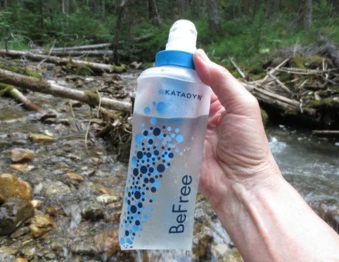 They had the exact filter system I wanted, which was just great. And in case you don't know how all that works, I use the Katadyn Be Free. And what you do is you go to a stream or some other kind of water source, and you fill the bag with water — I have a three-liter bag, though you can get a smaller one — and then you screw the filter onto the bag, turn it upside down, and squeeze the water through the filter into your water bottles. I was able to get a whole new setup, which I’m pretty psyched about.